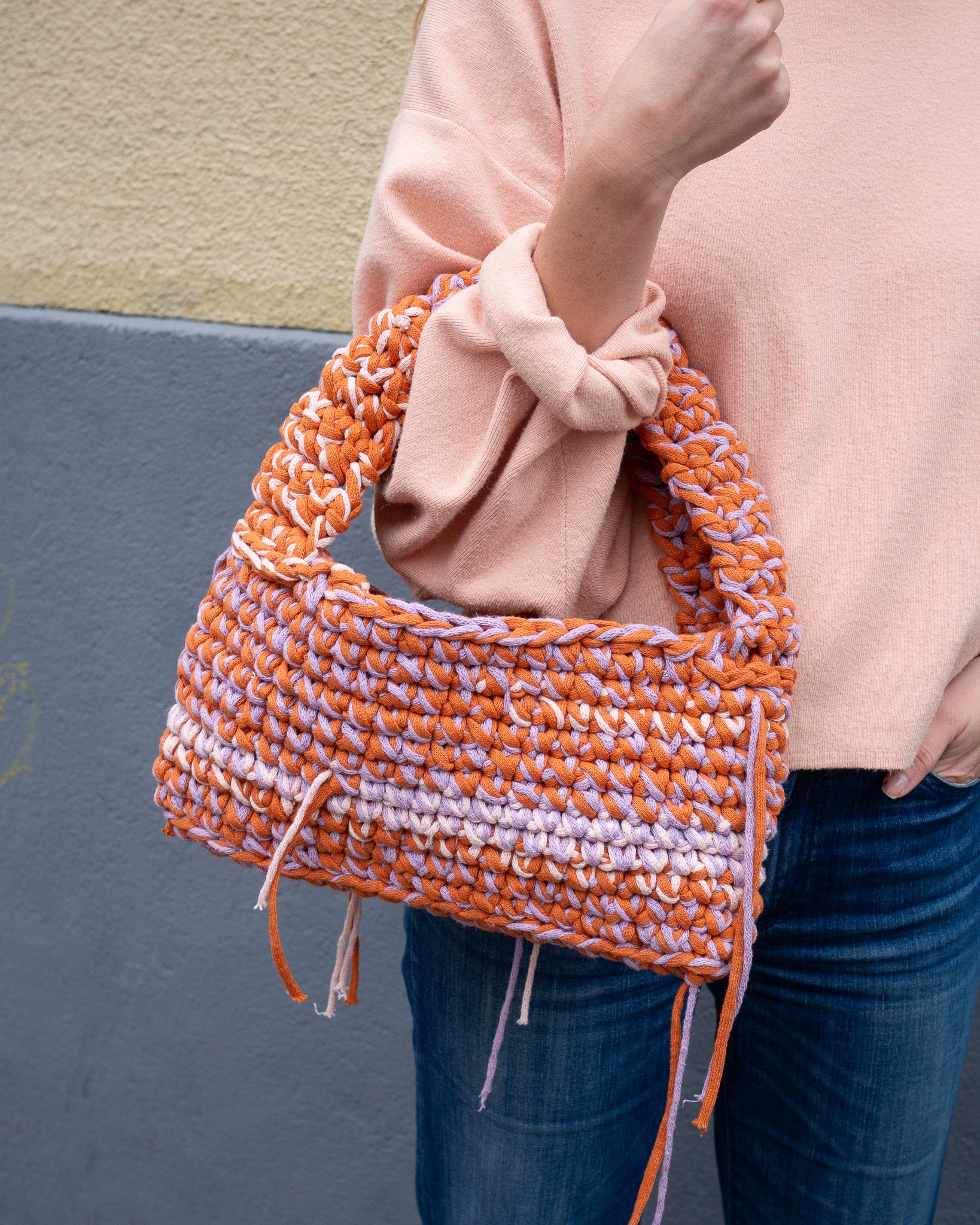 Dieses dicke Bandgarn (oder "Ribbongarn") ist sehr angenehm zu häkeln und leicht zu handhaben, auch für Anfänger. Das Garn wird aus Materialien hergestellt, die aus Resten der Textilindustrie stammen. Der Prozess wird zudem umweltfreundlicher durch die Tatsache, dass die Garne nicht separat gefärbt werden müssen, sondern die Farbe von den Stoffresten kommt, aus denen das Garn hergestellt wird.