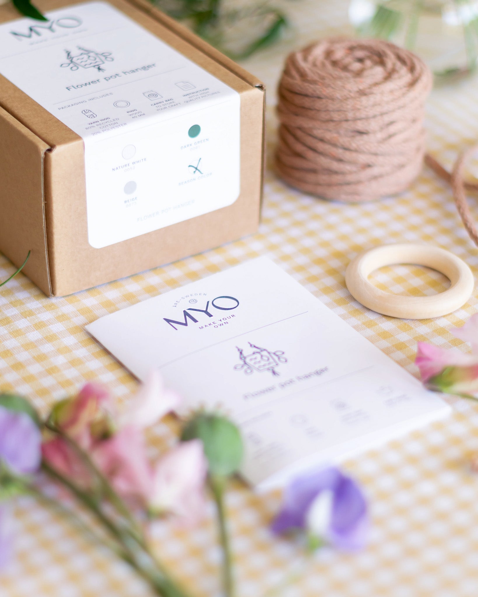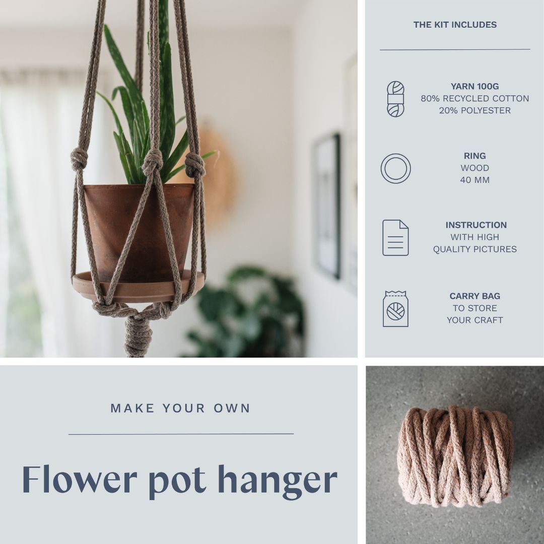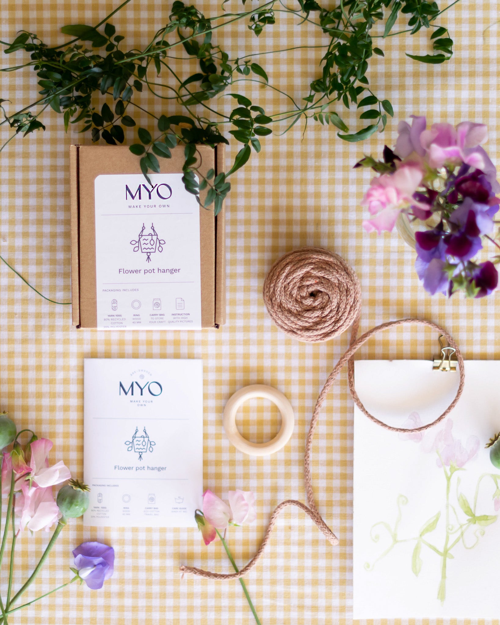 Ben je nieuwsgierig naar het maken van macramé maar weet je niet hoe je moet beginnen? Met het productpakket van MYO maak je een mooie hangpot die je kunt ophangen op je favoriete plek in huis. Dit is een eenvoudig project dat vooral geschikt is voor jou als je nog nooit macramé hebt gemaakt. De hangpothouder is verkrijgbaar in vier geselecteerde kleuren; natuurwit, beige, bosgroen en perzik (seizoenskleur met beperkte oplage).