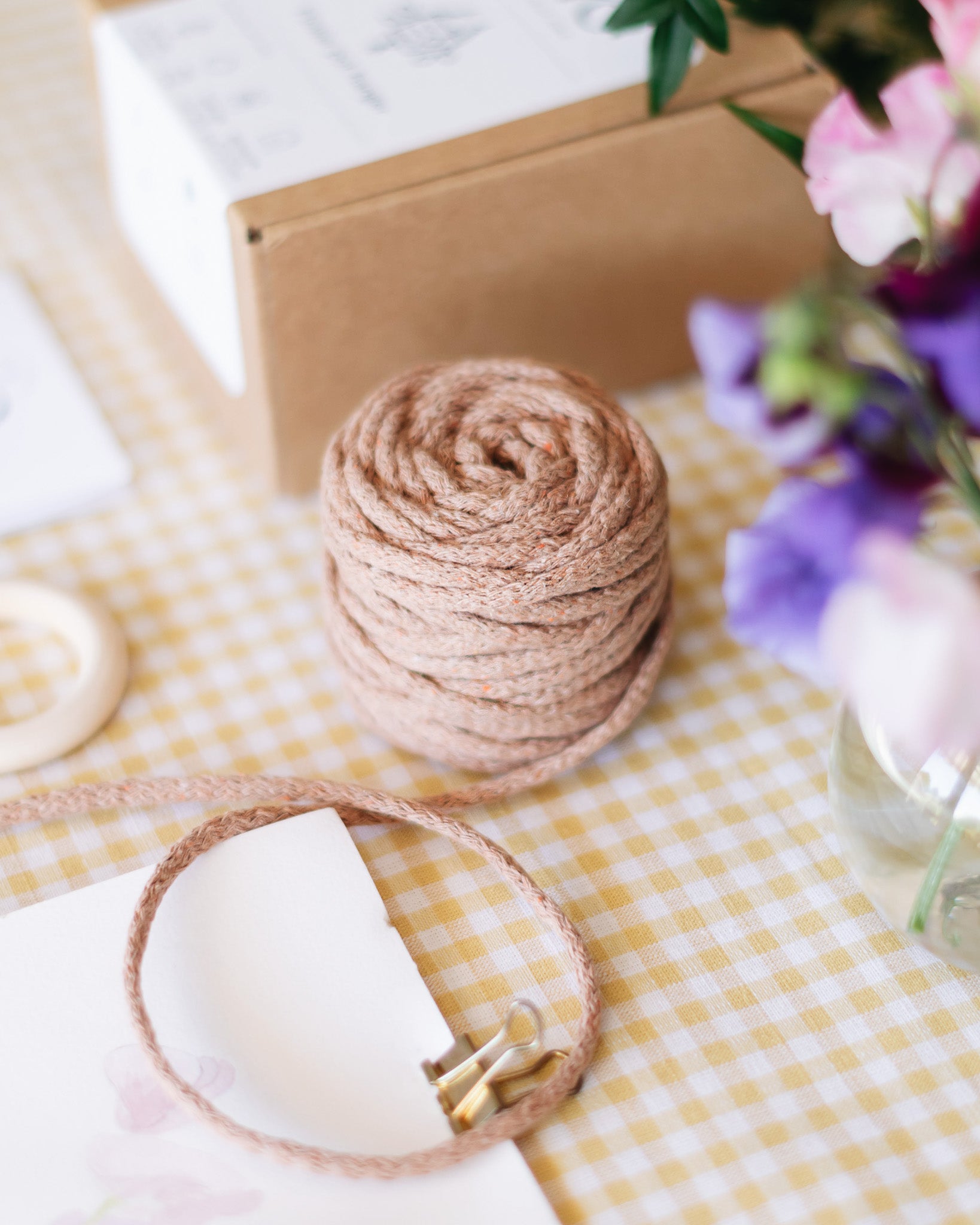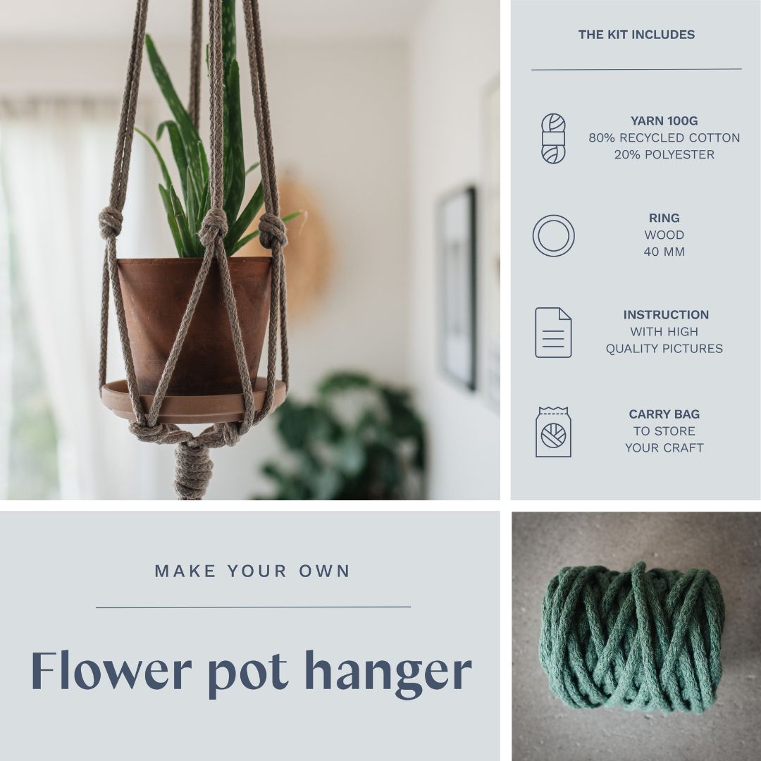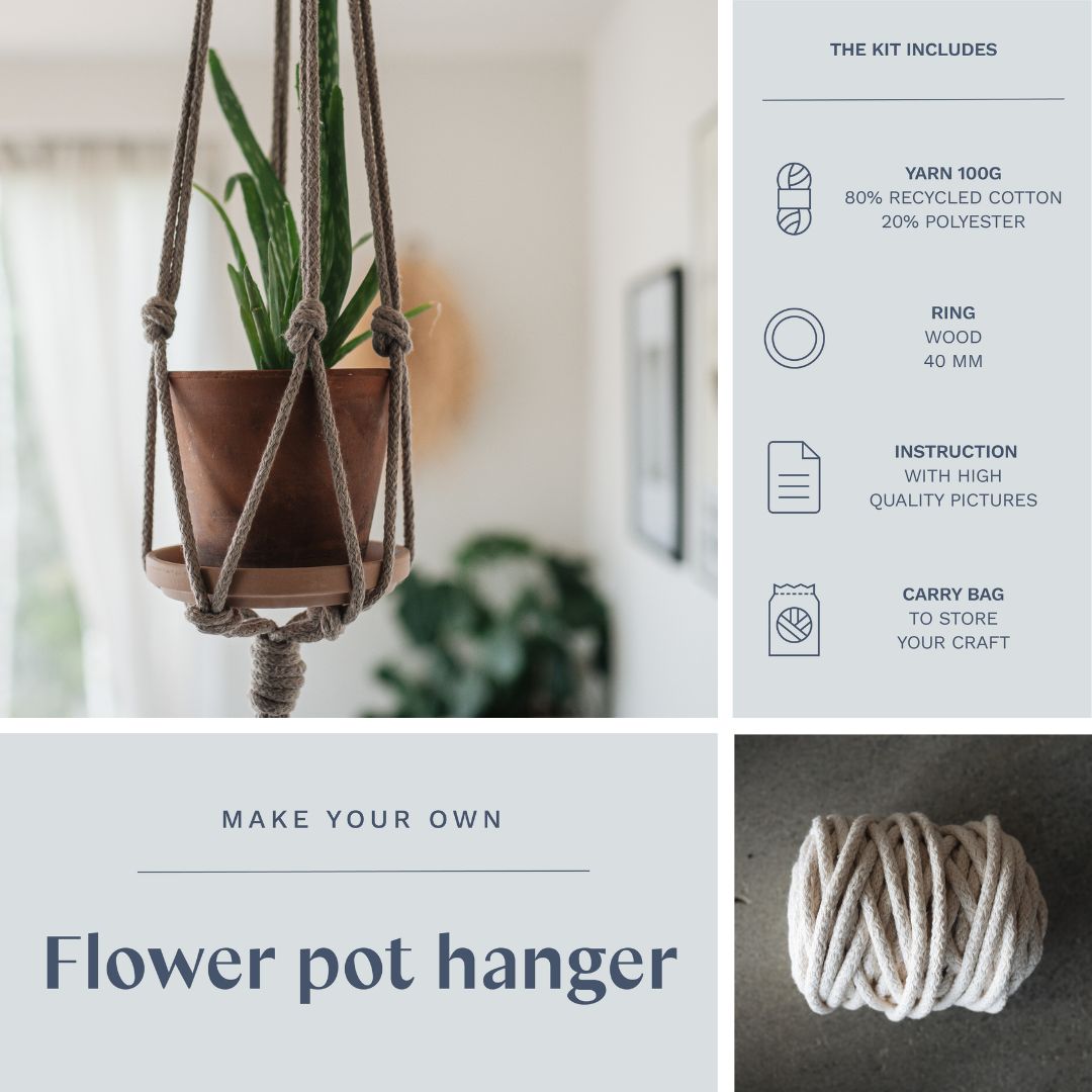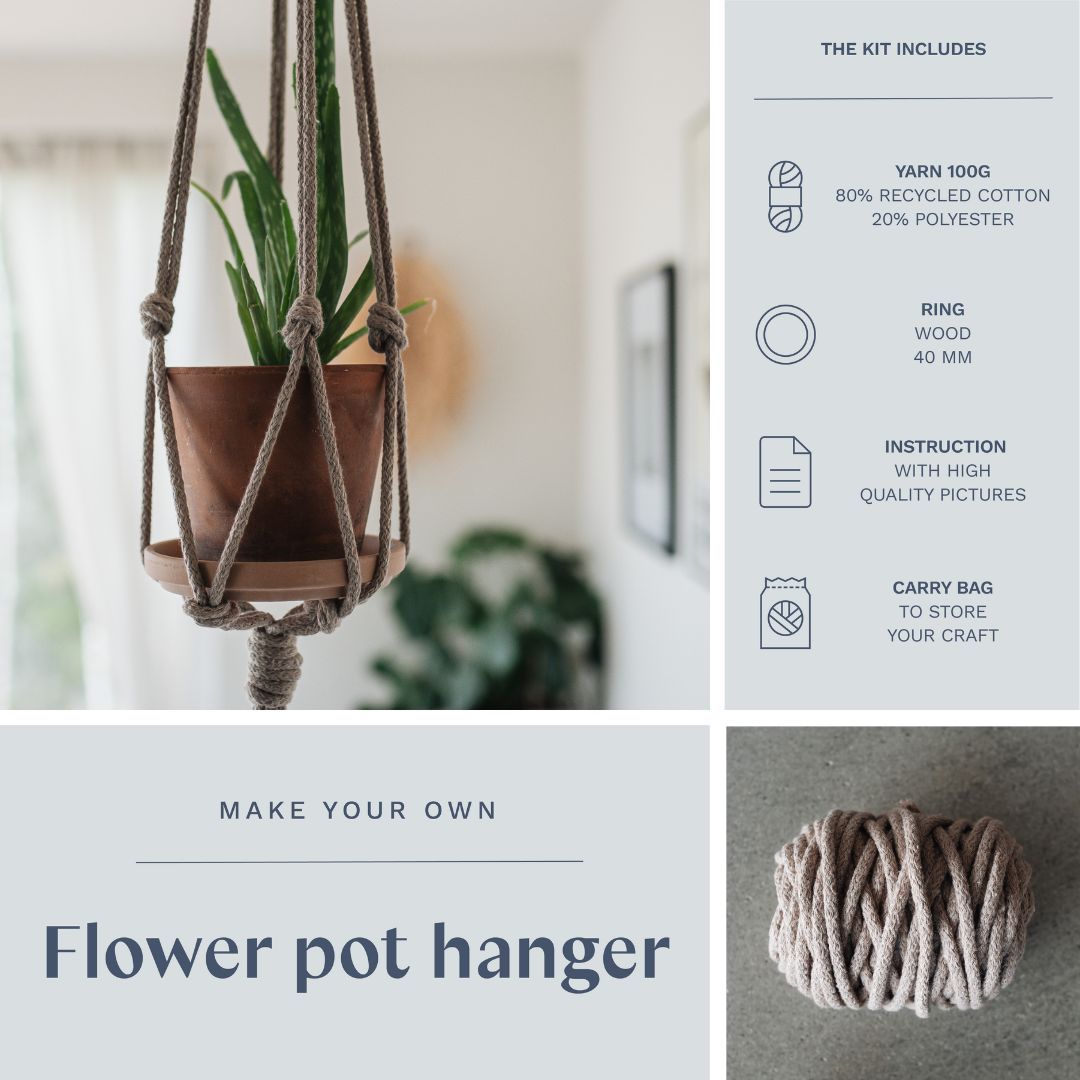 Ben je nieuwsgierig naar het maken van macramé maar weet je niet hoe je moet beginnen? Met het productpakket van MYO maak je een mooie hangpot die je kunt ophangen op je favoriete plek in huis. Dit is een eenvoudig project dat vooral geschikt is voor jou als je nog nooit macramé hebt gemaakt. De hangpothouder is verkrijgbaar in vier geselecteerde kleuren; natuurwit, beige, bosgroen en perzik (seizoenskleur met beperkte oplage).