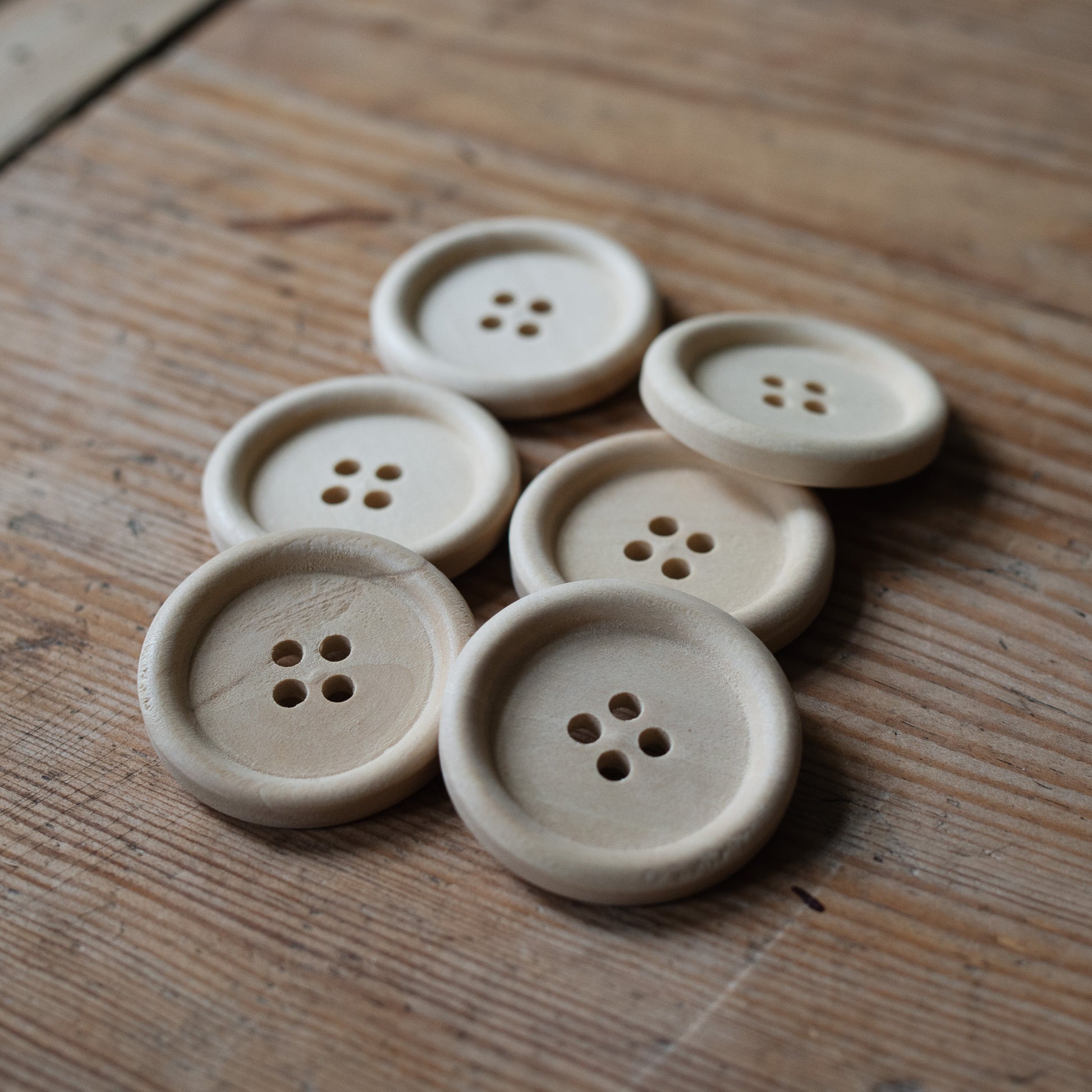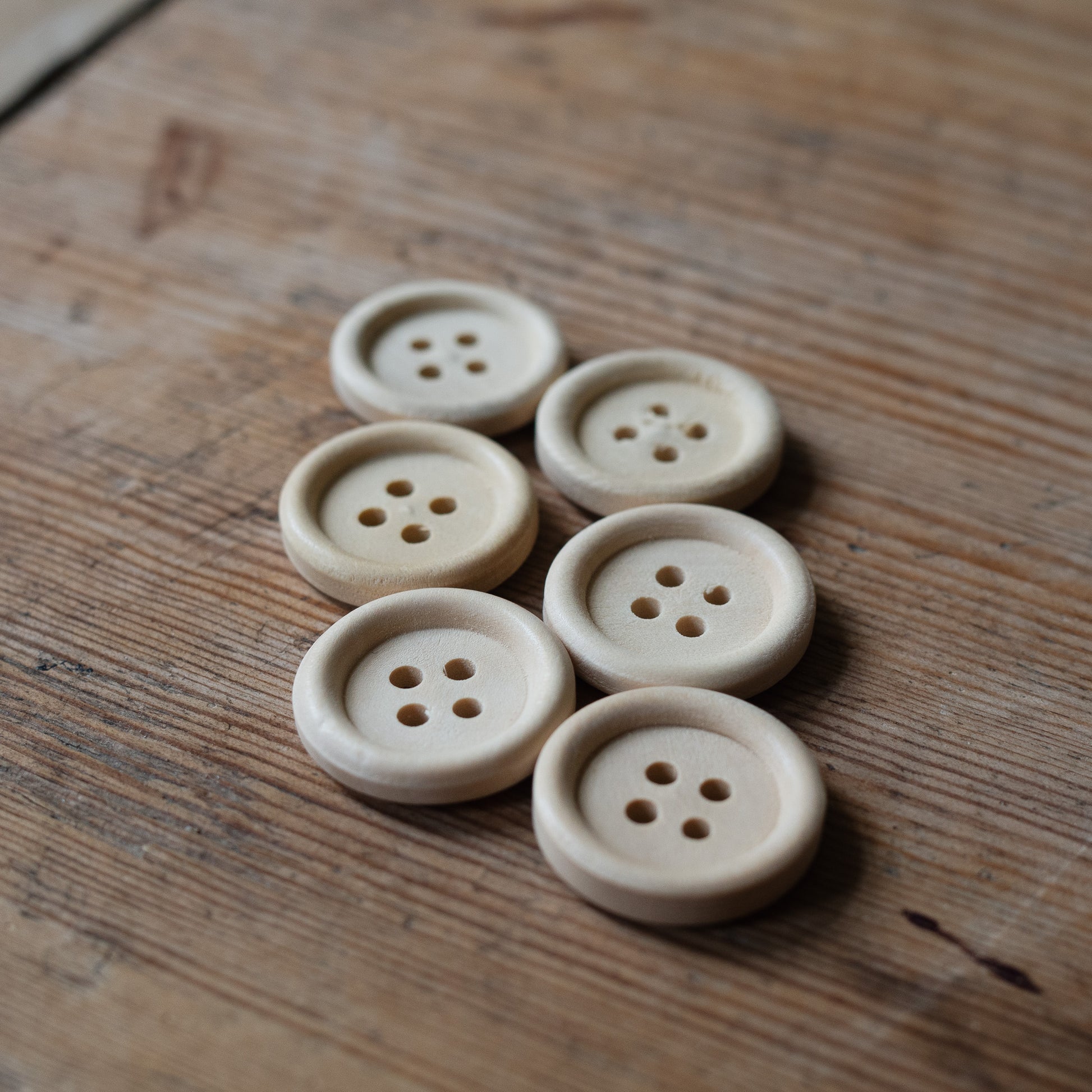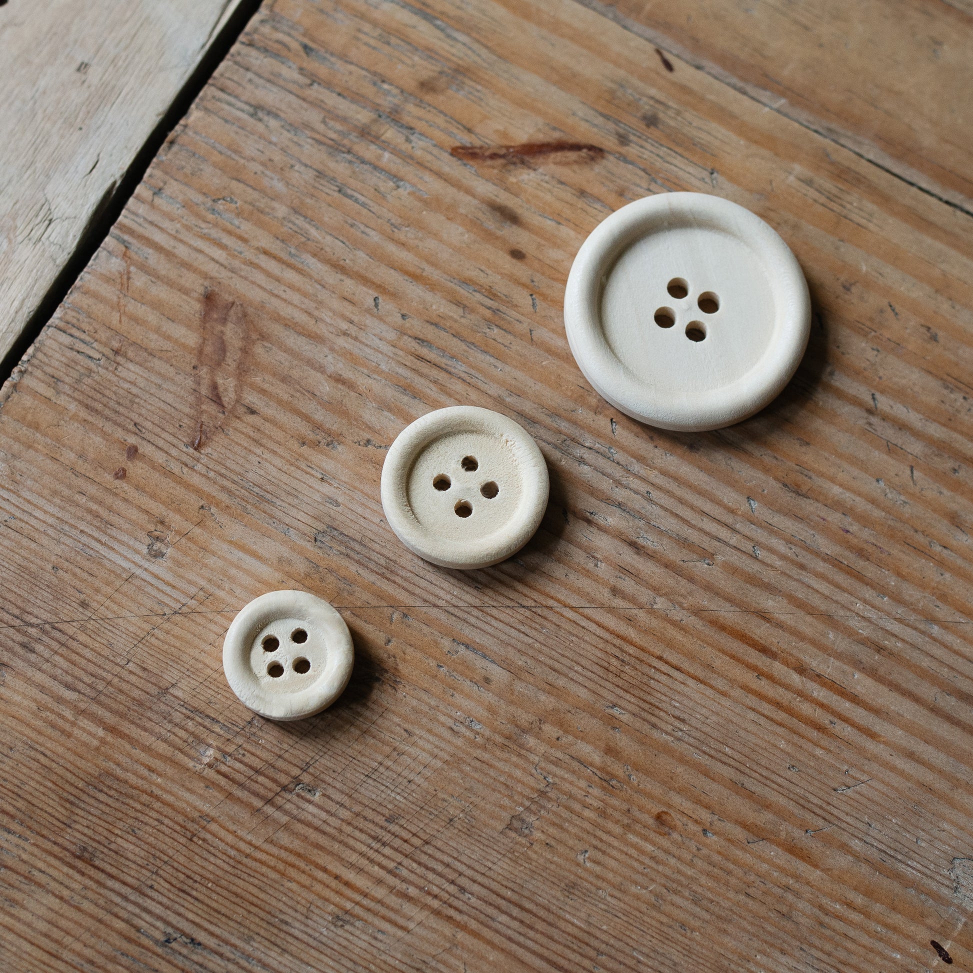 Knopen met vier gaten, van onbehandeld hout in FSC-gecertificeerd Schima hout. Erg mooi om op je kleding te naaien.