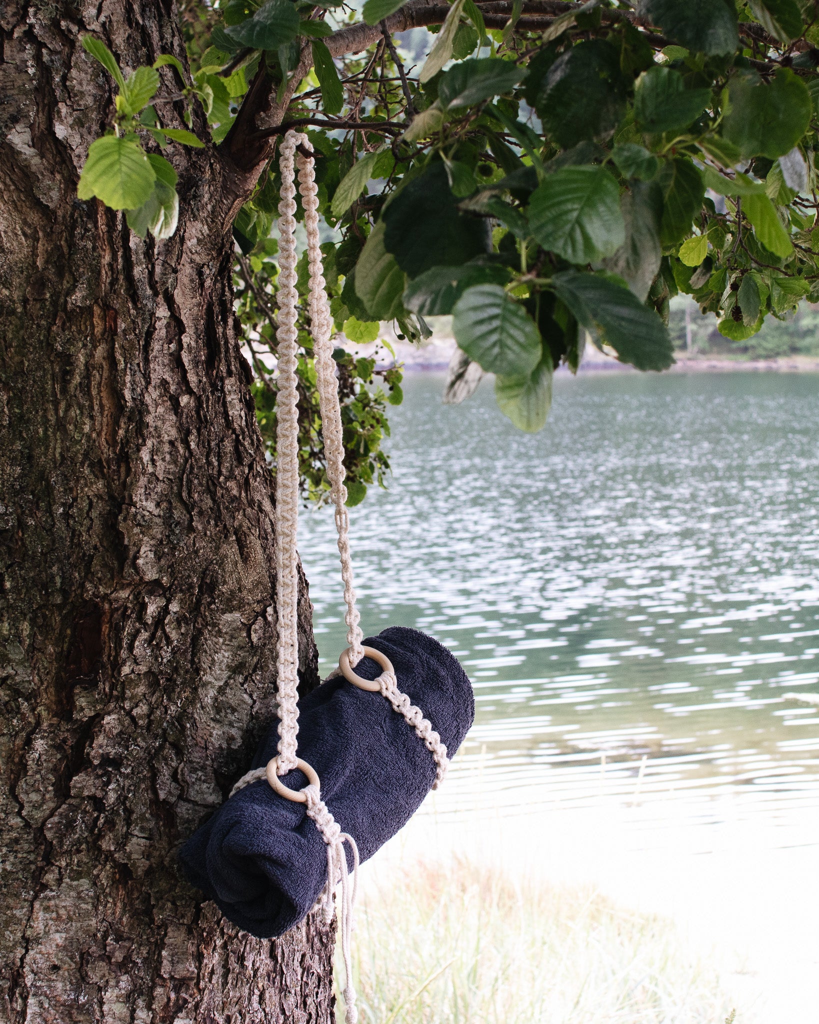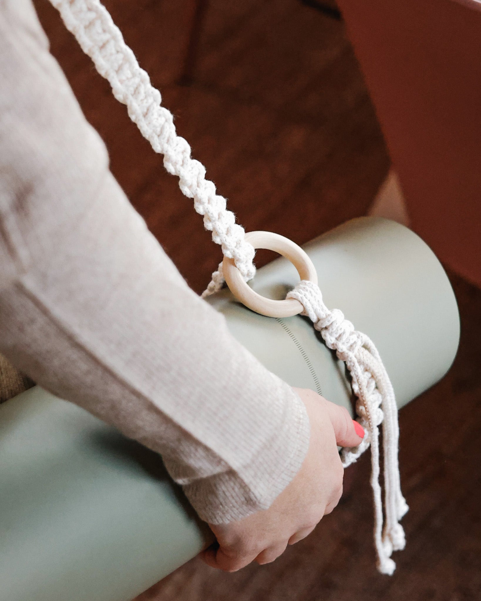 Detta projekt passar utmärkt för dig som är nybörjare i makramé. Den fina remmen som du skapar kan du använda till att ta mattan med till gymmet, eller för att hänga den på väggen. Dessutom är bärrem gjord av 80% återvunnet bomull, vilket är ett miljövänligt alternativ till yogamattsväska. Tack vore träringarna sätter remmen sig tight runt din yogamatta.