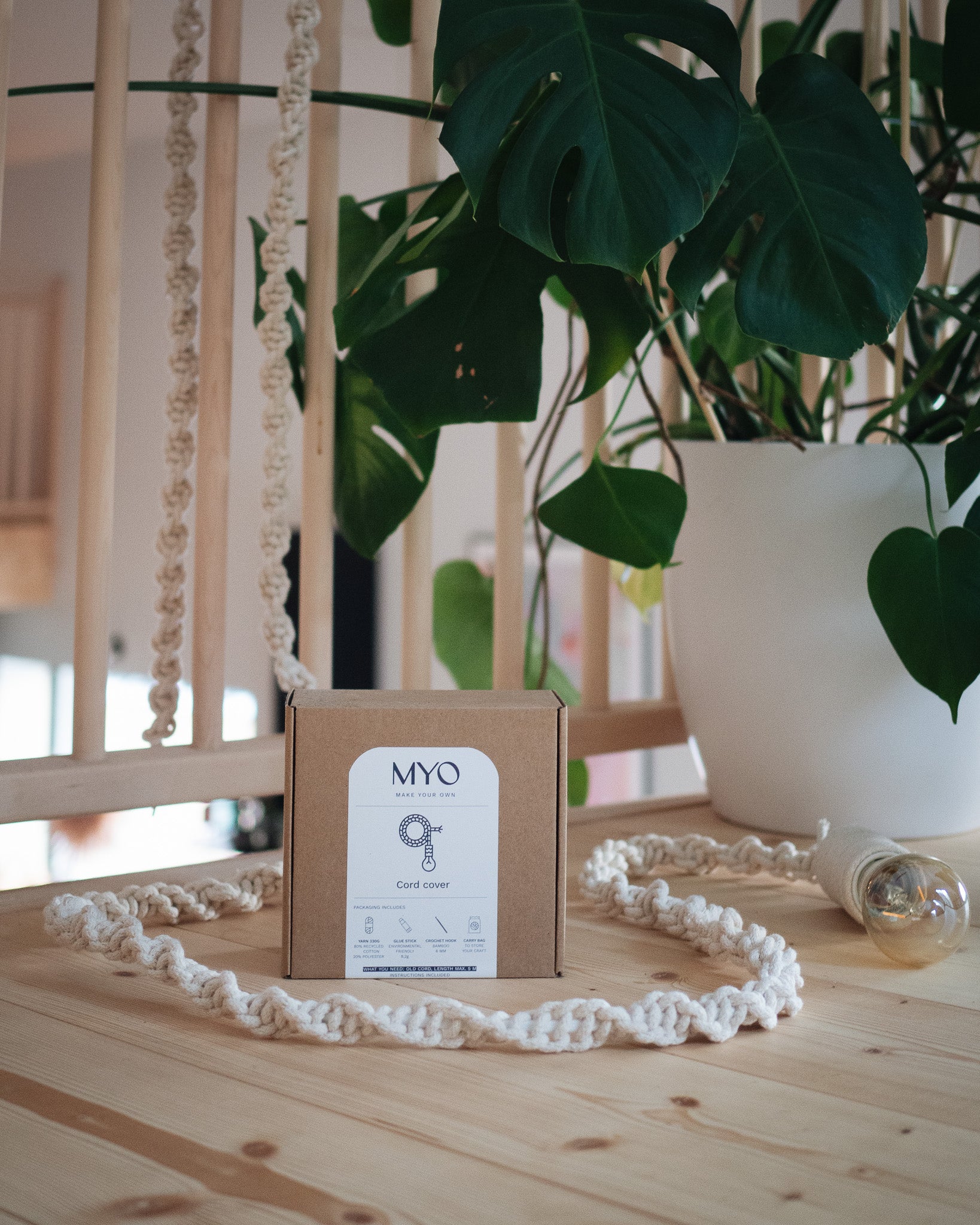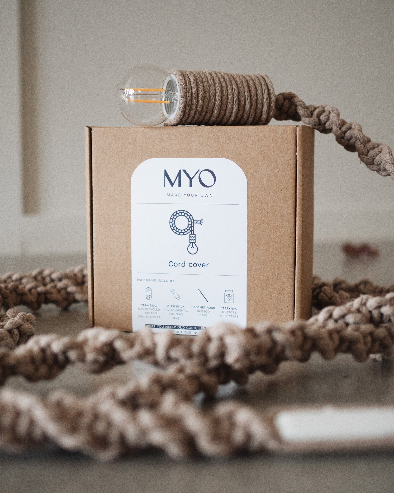 MYO's produktpaket inkluderar allt du behöver för att täcka dina gamla sladdar och få dom att se mysigare och vackrare ut i ditt hem. För att använda denna teknik till en lampsladd behöver du en lampsladd, max. 5m lång som dom flesta teknikaffärerna säljer - ifall du inte skulle ha en gammal sladd hemma. Får du över garn från ditt projekt så kan du med samma teknik klä in även andra, kortare sladdar; till exempel mobilladdare!